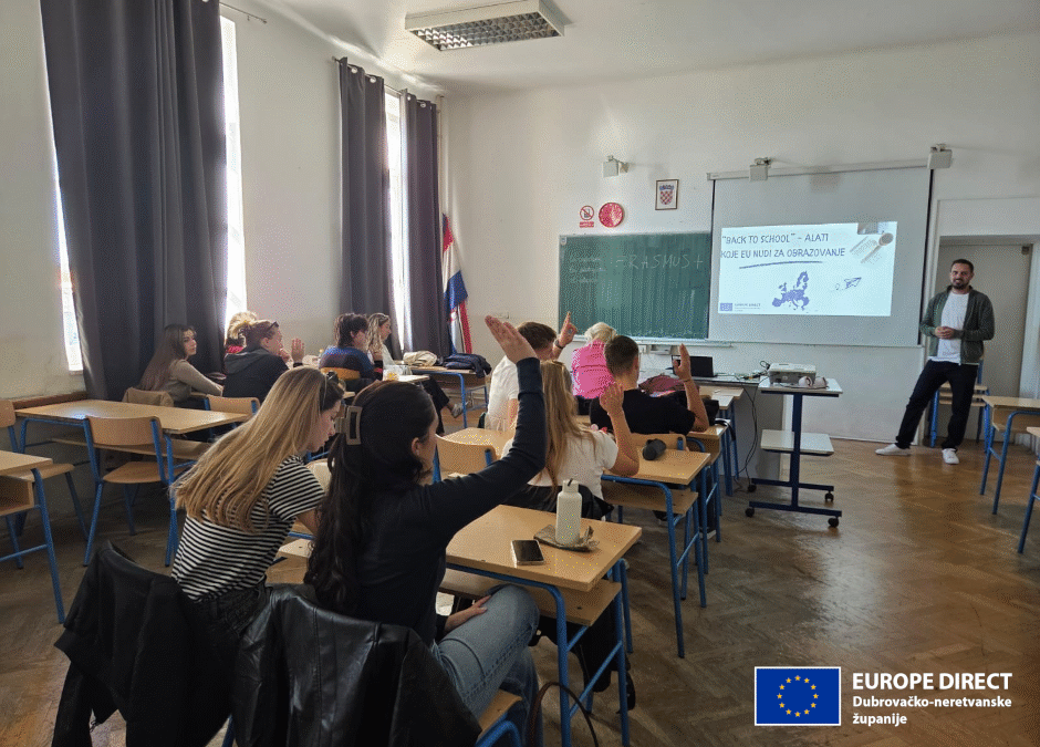 U sklopu aktivnosti projekta EUROPE DIRECT Dubrovačko-neretvanske županije, u Gimnaziji Dubrovnik 9. listopada 2025., Marko Žmirak, predsjednik Centra za karijere mladih Dubrovnik, održao je predavanje za učenike s ciljem predstavljanja ključnih obrazovnih alata i prilika koje nudi Europska unija.